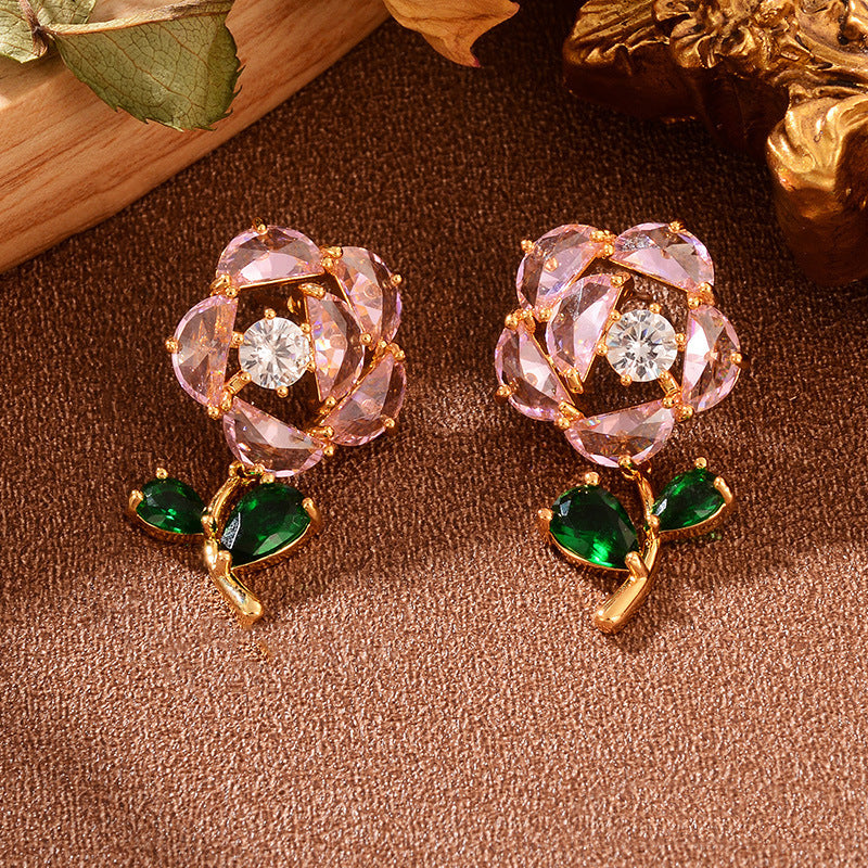 淡いピンクパープルの花びらとエメラルドのように輝く葉が、耳元に幻想的な彩りを添えます。中央のクリスタルが光を集め、角度によって表情を変える上品な輝きを演出。